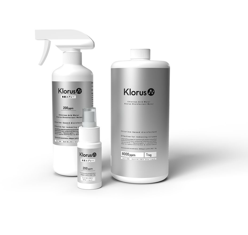 クロラス酸水は、汚れなどの有機物存在下でも除菌効果を発揮する唯一の塩素系除菌剤です。その特性から、厚生労働省をはじめ、各省庁から新型コロナウィルスの除菌方法として対物など幅広い使用用途に推奨されています。アルコールを活用していた全ての用途に代用ができ、かつ圧倒的に低コストです。
